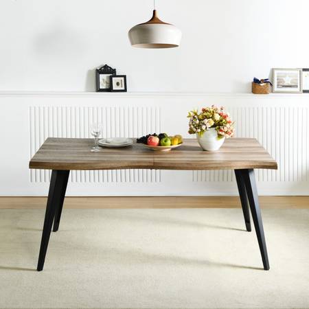 This set includes a 63-inch walnut table with a live-edge top and four Charlton upholstered chairs with curved backs and foam cushions. Strong powder-coated metal legs ensure stability and style. Simple assembly with included hardware.