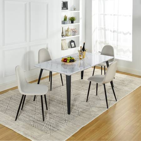 This clean, minimalist 5-piece set includes a spacious 62.9" table and four curved-back upholstered chairs. The matte black legs provide stability while giving the entire set a sleek silhouette. Great for kitchens, dining rooms, breakfast areas, or rental units. Easy to assemble, durable, and built for everyday comfort.