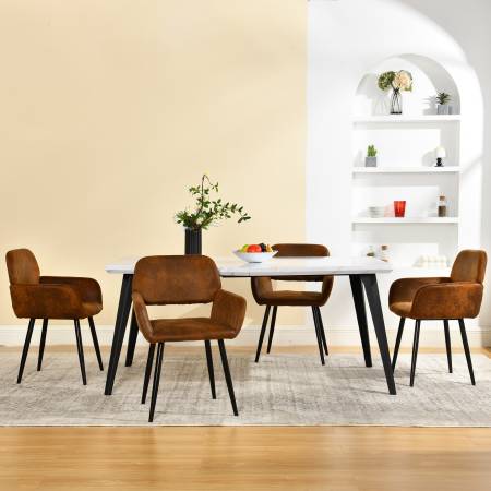 This contemporary set includes a white faux-marble MDF table with strong black iron legs and four California swivel chairs. Chairs feature curved backs, padded seats, smooth 360° rotation, and a warm suede-brown finish. Stable, durable, and comfortable for daily use in dining spaces, breakfast areas, or compact urban layouts.