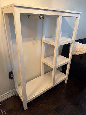 Versatile white shelf unit 39 x 52 x 13.5 comes with a rod to hang clothes or a blanket and two shelves. Used but in good condition. Pick up only. Closest intersection is Davenport/Bathurst.