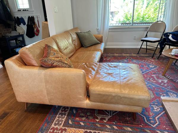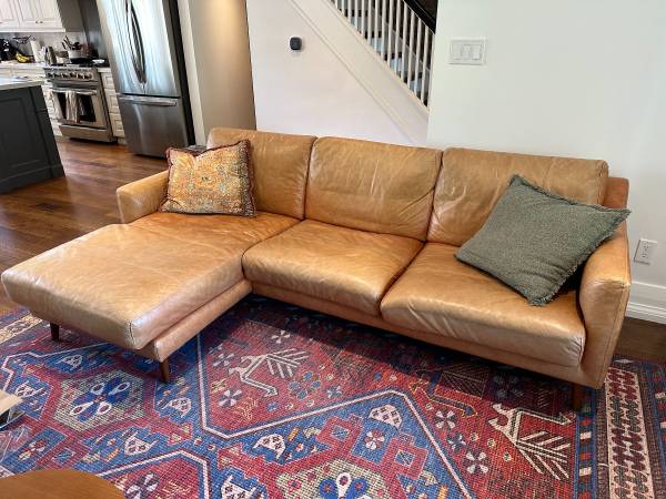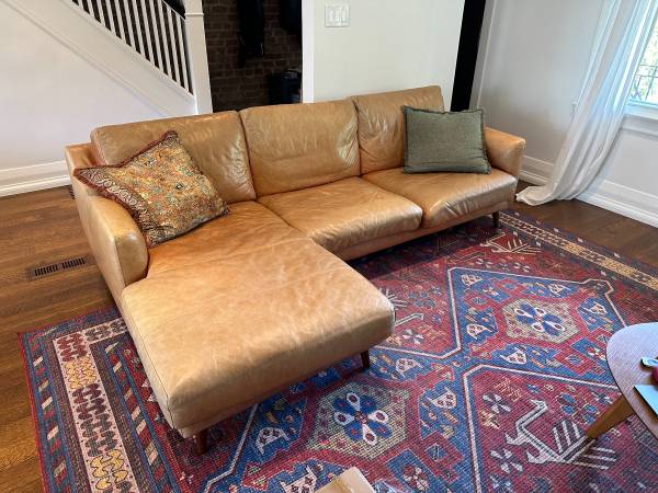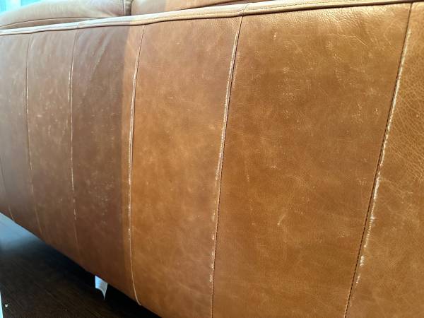 Couch is a beautiful natural leather and has been treated lovingly. We honestly love it so much, and sadly the chaise is on the wrong side for our new home.