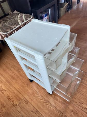 This is a four-drawer plastic cabinet perfect for organizing any space. This unit comes with four clear drawers and sits on casters. It is in used condition, as you can see in the pictures.