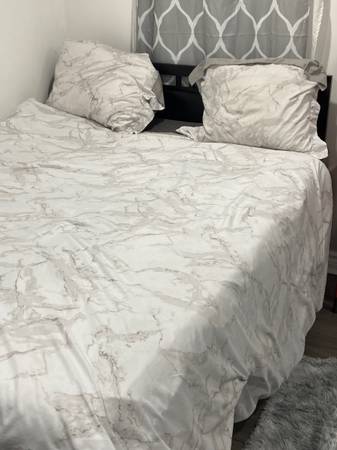 Great Queen bed with mattress. There is a mattress waterproof protection cover on the mattress. Please check measurements on pictures