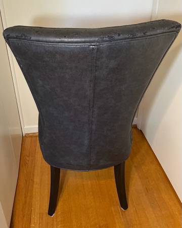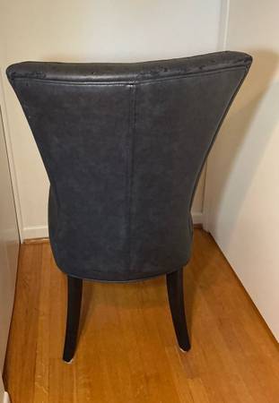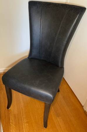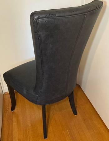 These sturdy, high backed, very heavy leather chairs are so super comfortable that your dinner guests might not want to leave! Buy one for $50 or take both for a total of just $90. Two are available.