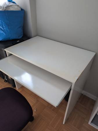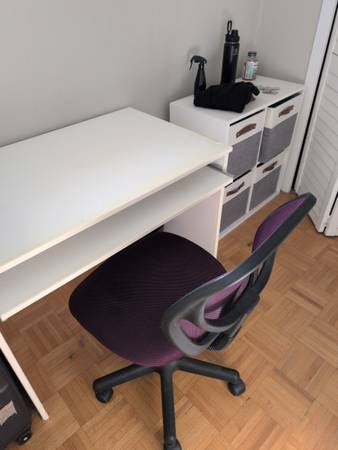 Study desk and computer chair for sale. In near-perfect condition. The desk also includes a slide-out for a keyboard. Perfect for smaller rooms and student housing. There is a slight discolouration of the laminate on the top of the desk. And the laminate is slightly peeling on the sides. But both these issues can easily be fixed by cleaning and some glue.