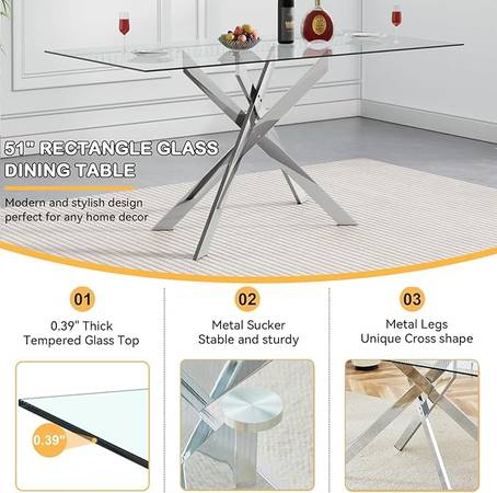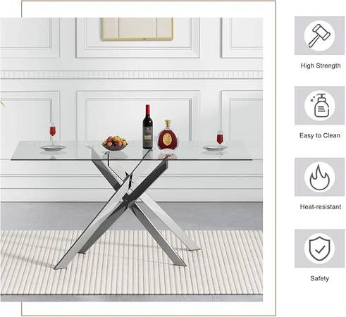 - Table features a 0.32" thick tempered glass top and unique silver chromed metal cross legs.