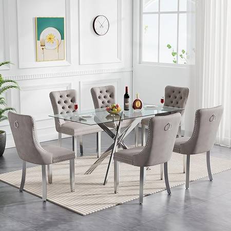 Modern 7-piece dining set consisting of a rectangular glass table and six elegant grey velvet dining chairs, featuring chrome bases and deep tufting for a chic, contemporary look (51"L x 30"W x 30"H).