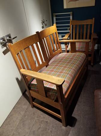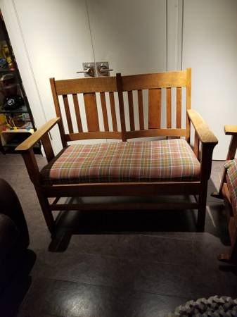 Oak Mission Style rocking chair and 2 seater settee with spring supported upholstered seats. In fine comfortable condition.