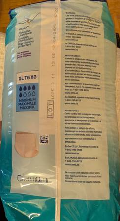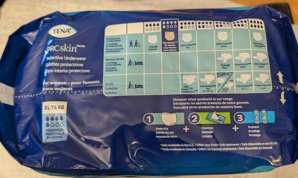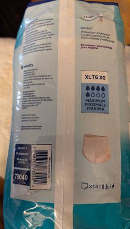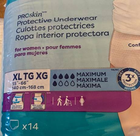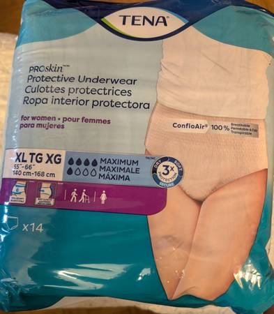 I'm selling four packs of TENA ProSkin Protective Underwear for women, size XL/TG/XG (55"-66", 140cm-168cm). These protective underwear provide maximum absorbency and are designed to look and feel like regular underwear. They are brand new in sealed packaging.