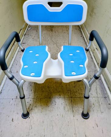 Premium shower chair, assembled but unused, perfectly clean. Cutaway design allows for easy washing and rinsing. Height adjustable. See Amazon description....