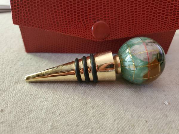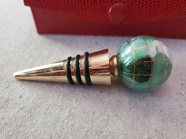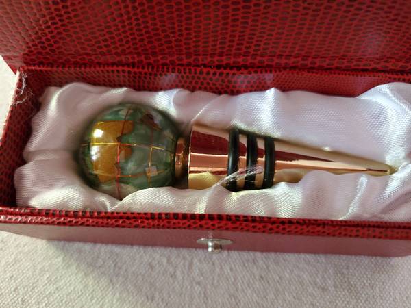 Pretty glass and brass bottle stopper in a red case. $5.00, pick up only.