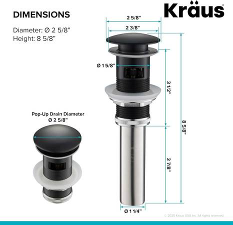 1/2 price for this brand new drain assembly by Kraus model PU-11MB to fit a semi-recessed, basin, or undermount bathroom sink that has overflow. (your sink must have an overflow). Fits sinks with 1.75" drain opening All metal construction, no plastic. White, as photo, new / never installed still in its original Kraus box. You can see the Black model on amazon $53 w tax, perhaps they discontinued the White. Price is very firm.