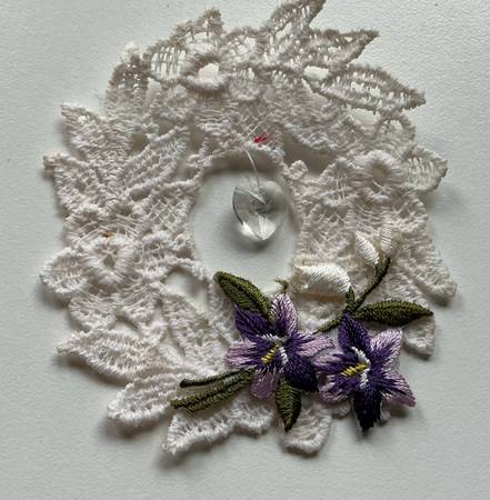 (ii)A Crocheted Wreath, decorated with flowers and a crystal. Also works as a blind pull or fan pull. 4" (10 cm) diameter