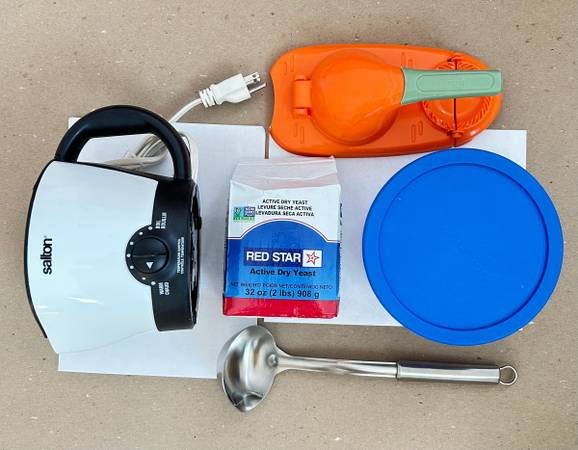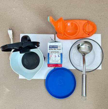 Moving sale #14: $5 Salton multi-cooker MP-1206 $5 2-in-1 dumping maker $5 2lbs Active dry yeast, exp June 2024 $4 Anchor round glass storage with lid 7cups or 1..75qt $3 New 304 stainless steel oil...