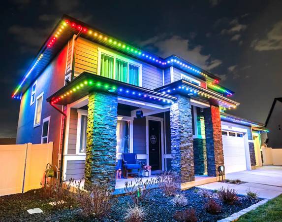 I install permanent LED lighting under the gutters — perfect for Christmas, holidays, security, and year-round curb appeal.