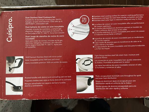 selling Brand new Stainless steel , 3 ply cooking set in original box, unused, selling for $100. cash firm. curbside pick up.