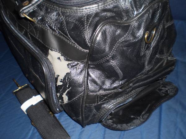 Leather Carry Rolling 2-Wheeled Luggage Carry by handle or shoulder strap Approximate size when packed 19Lx11Hx10W inches Handle extends to 32 inches Zippers are functional Some leather peeling $10