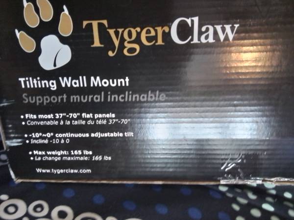 TygerClaw TV Wall Mount Bracket Adjustable wall bracket for large plasma/LCD/LED TVs. Suitable for TVs 37"-70". Tilts 10 degrees to 0 degrees. Inclines 10 degrees to 0 degrees. Pickup at Young...