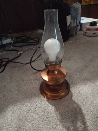 - Copper base with beautiful natural patina, clear glass chimney for soft glow