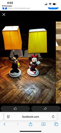 Here are two adorable Vintage Disney Mickey and Minnie Mouse table lamps! They would be perfect for a kids' room or a Disney collector. One is Mickey Mouse and the other is Minnie Mouse. Please see photos for condition. Minnie has been glued in one section. From a pet friendly, smoke free home. Porch Pickup Only. Asking $50 for the pair, or best offer. Closest main intersection is Jane St and Eglinton Ave.