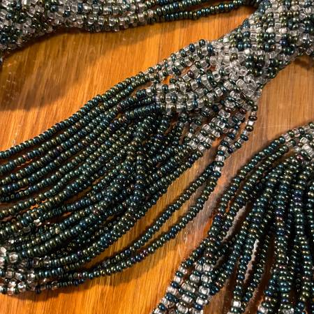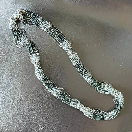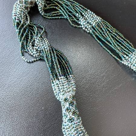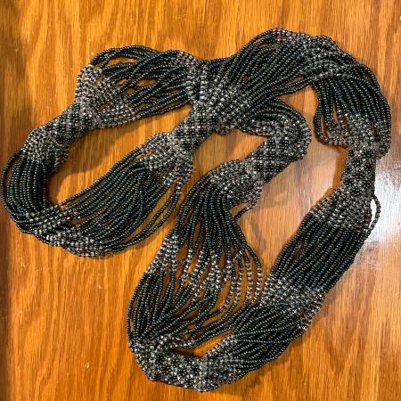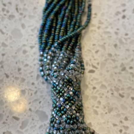 Selling a beautiful thick beaded necklace. Made up of 20 strands of beads with a teal/turquoise hue and some darker purple/pinkish and clear beads, that make the necklace shimmer. I tried to take pictures with different lighting to capture the look. Pristine condition. Like New.