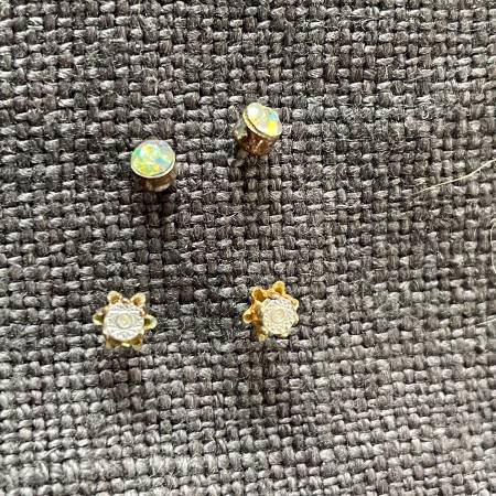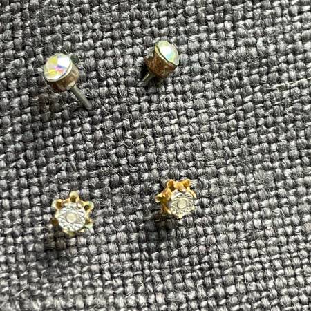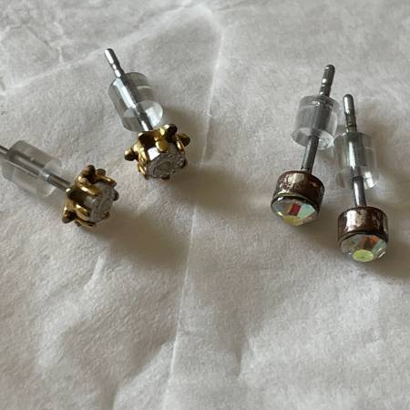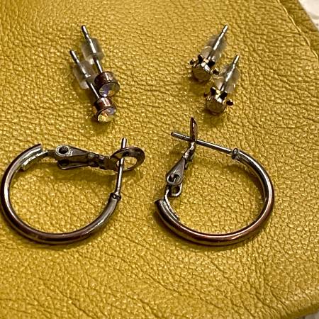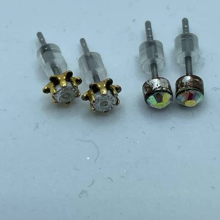 Selling 2 stud earrings and 1 pair small hoops for pierced ears. 1 clear opalescent gem and one with a tiny silver disc. Hoops are silver toned. Asking $10 for the trio of earrings. Available for...