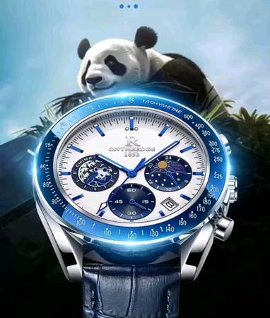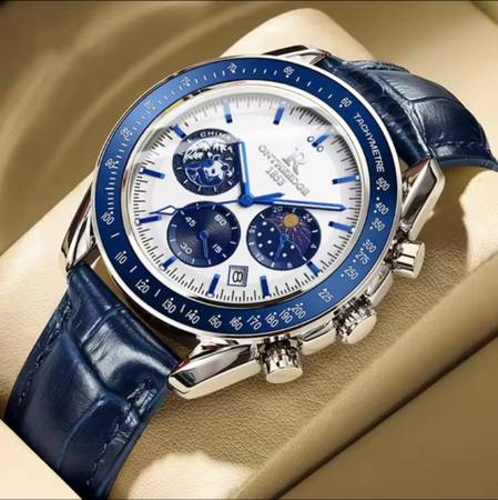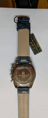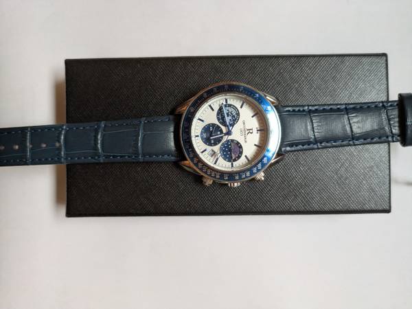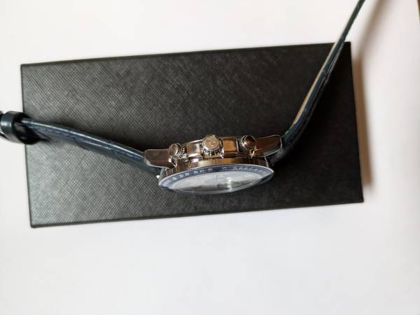 New, never worn. Six hands, date and tachymetre scale. 40mm stainless steel case x 12mm thick. Water resistant to 30 metres. Not meant for swimming or diving. Sapphire crystal. Blue/black 8" leather...