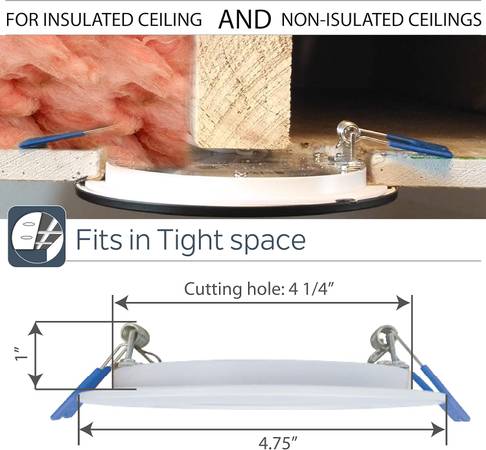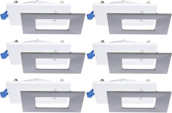 Nadair 4" LED recessed Ultra Slim Lights, 6-Pack. Dimmable 12W, 900 Lumens, 3000K (Warm White). Square 4-3/4" White trim face, with Brushed Nickel trim face included. 12 Watts LED (equivalent to 80W Halogen). Installs everywhere, indoors or outdoors and fits in tight spaces, requiring only 1" ceiling clearance. Easy Quick Connect wiring. Brand new and unused, carton contains 6 lights. Can see on amazon selling $131 (116+tax).