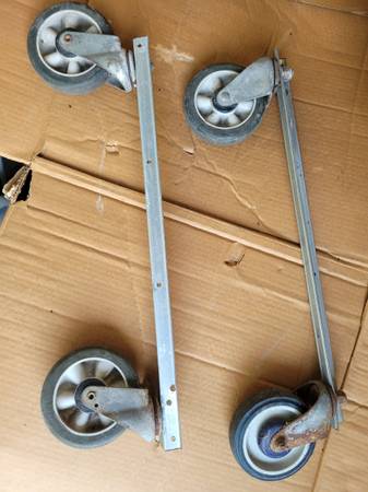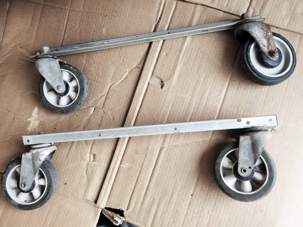 Set of 4 caster wheels. 5" diameter, heavy duty. All 4 wheels are swivel wheels. Currently bolted to steel angle profile, so it will be very easy to make a custom size movers dolly, or any size of...