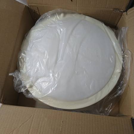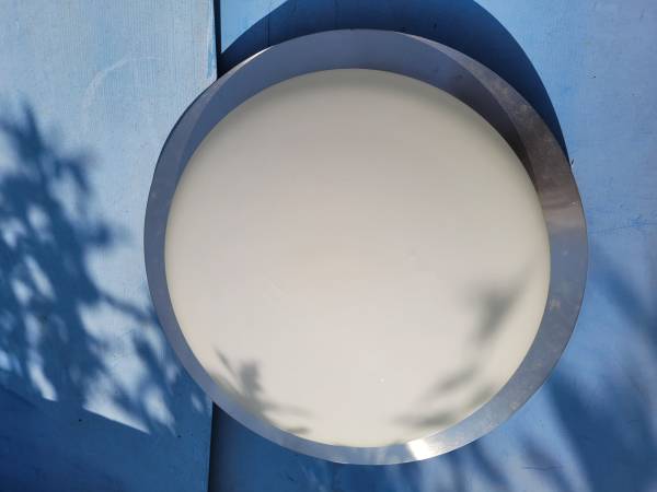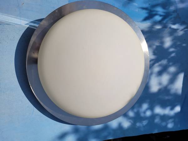 Flush-mount light fixture (ceiling light). Stanless steel 16", with White Milk Glass shade.