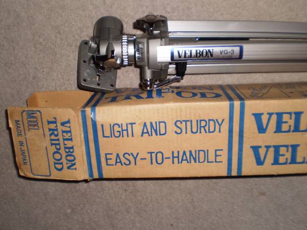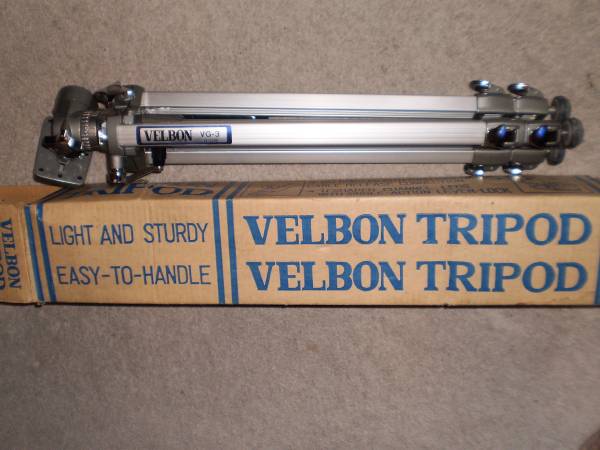 1 Velbon VEB 3, 54-148 CM, 3 Way Head $100 with BONUS FREE Velbon VEF-3 (NO head) 2 Velbon VG-3 Tripod, in original box does not look used $75 3 Velbon VGB-3 tripod Height: 25in column unextended...