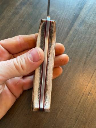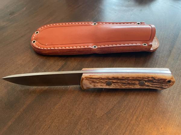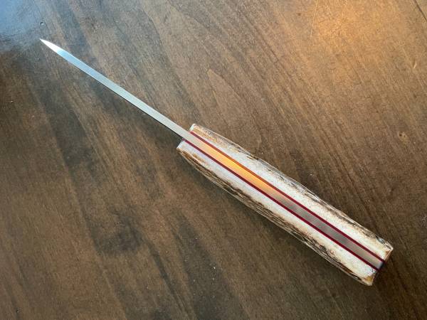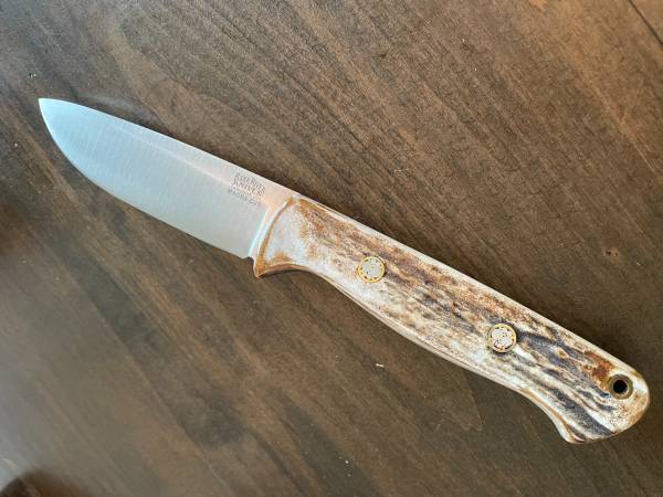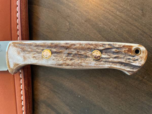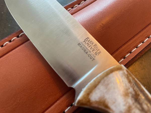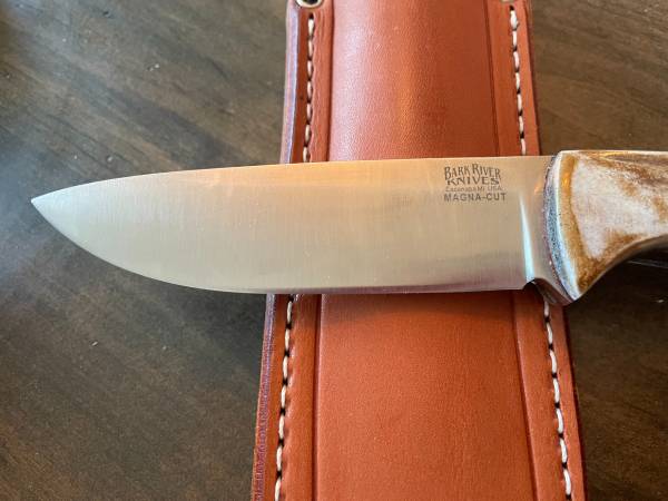 I custom ordered this Bark River Bravo 1 LT drop point in magnacut with elk handles, red g10 liners, and mosaic pins in a high-sabre convex grind.