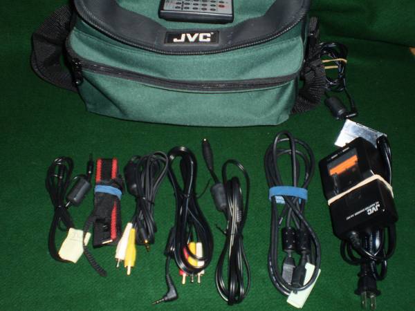 with battery, AC charger, AV cables, remote and bag