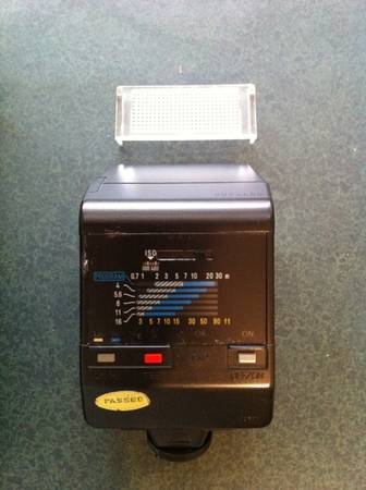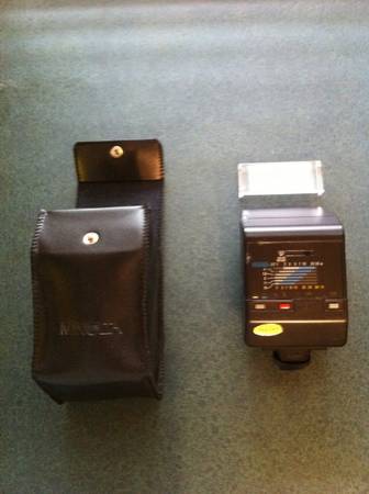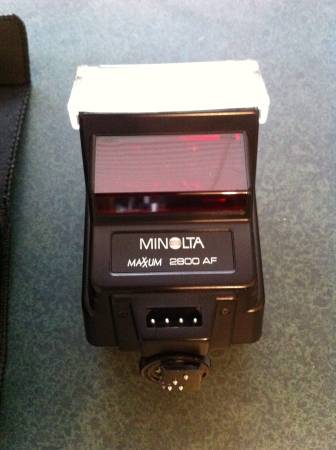 Here we have a Minolta Maxxum 2800 AF flash in excellent condition with original Minolta manuals and box. This flash uses a standard hot shoe and can be adapted to non-standard hot shoes.