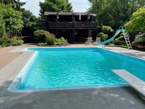 This charming property sits on an expansive, private lot surrounded by lush gardens and features a large in-ground pool, a sunny deck, and multiple walkouts—perfect for entertaining or relaxing in your backyard oasis.