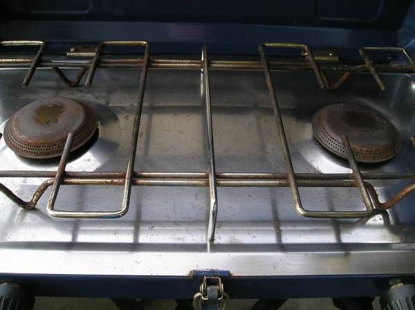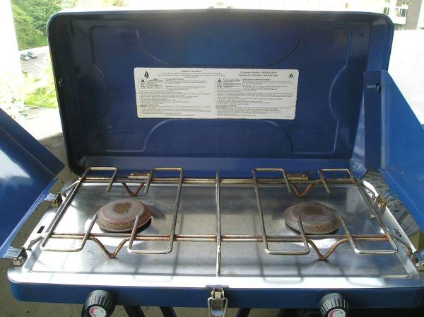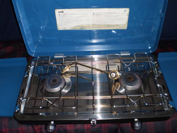 Broadstone 2-burner Propane Stove, complete, Boxed As New $75 Woods 2-Burner Propane Stove Model 76-2745-6 for parts or repair, only 1 burner works, there is NO stove-gas canister connector $10
