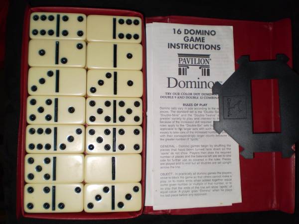 Dominos By Pavilion With Instructions and Case DOMINO SIZE: 2 x 1 x 3/8 inches $20 Pickup ONLY