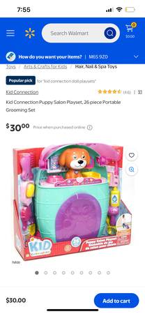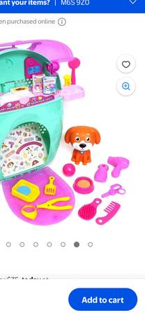 Kid connection puppy salon grooming playset! It includes a variety of grooming tools and accessories for pretend play. Your little one can groom and style their furry friends with this fun playset. It has a puppy salon and comes with a toy dog! Missing 2 pcs circled but has additional pieces added.