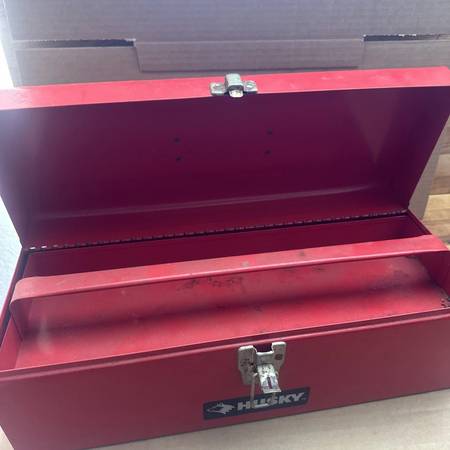 HUSKY RED TOOL BOX WITH INSIDE TRAY.. 19 INCHES WIDE 7 INCHES DEEP 7 INCHES HIGH GOOD CONDITION. $55.00 OR BEST OFFER.