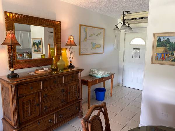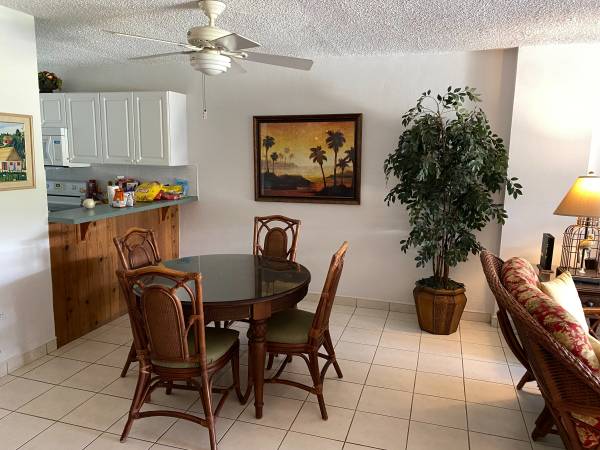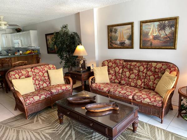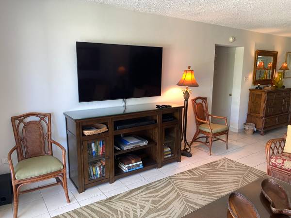 Condo has all you need for a nice weeks' vacation including a fully stocked kitchen, sitting area with 65" tv, free WIFI, 2 bedrooms, one with King sized bed and one with 2 twins. 2 full bathrooms. Veranda facing the garden. Reserved parking. All the linens and beach towels included.