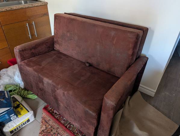 Doing some house cleanup, so this amazing loveseat sofa can be yours. It's clean, unfolds to create a 2-people bed ( I think double sized mattress sizing equivalent).