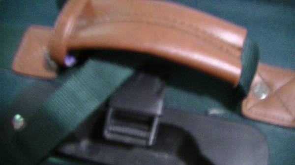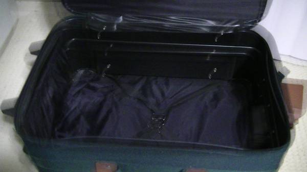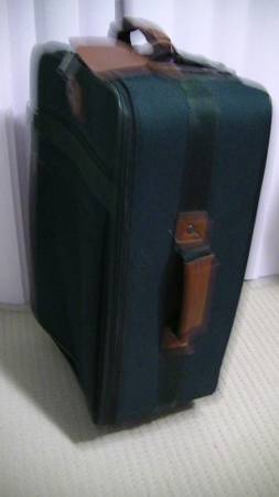 Good, dark green fabric travel suitcase. Natural leather handles. No damage. Smoking-free home. No pets.
