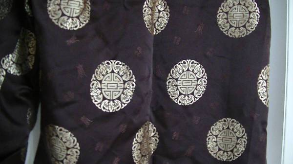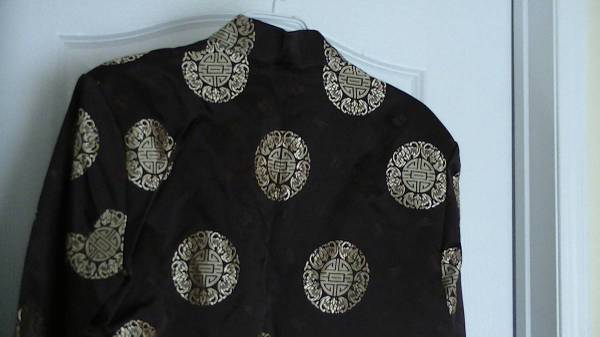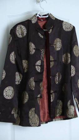 This is a brand new classic Chinese jacket for a woman. Fabric: Silk satin Color: Gold on chocolate. Size: Medium Never worn. No damage. Smoking-free home. No pets.