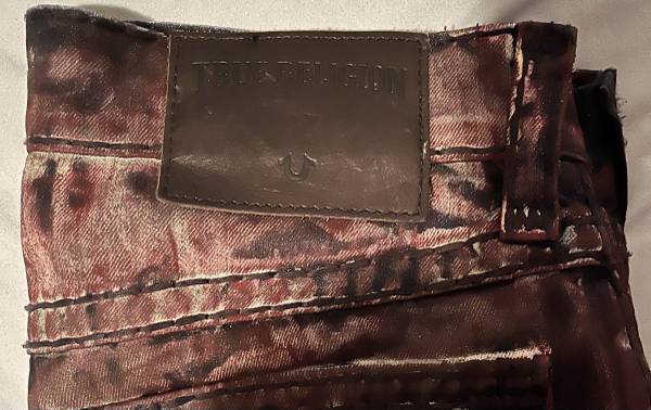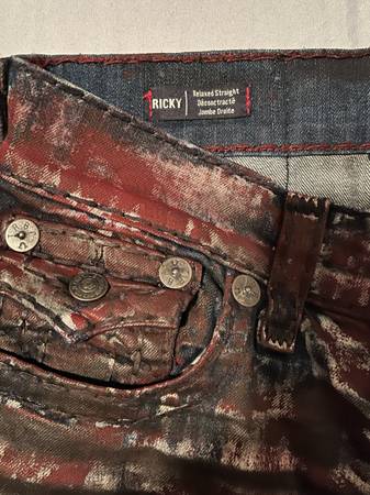Selling a pair of True Religion jeans. They have a unique, distressed look with a dark brown and red colour palette. Please see photos for details!