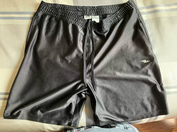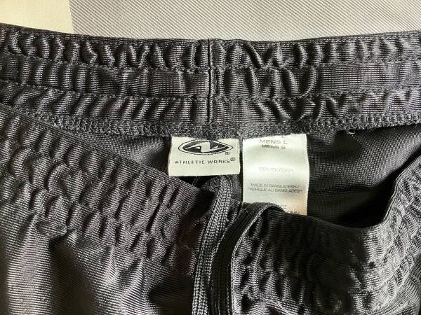 Black men’s Athletic Works shorts for sale. The size is large and the material is 100% polyester. The length of the inseam (from the private area to the hem or bottom of the shorts) is 9 inches, the length from the waist to the private area is 14 inches and the when the shorts are completely relaxed or not being worn the waist is about 38 inches. These are very loose and relaxed shorts, giving lots of room for your thighs to move and breathe.