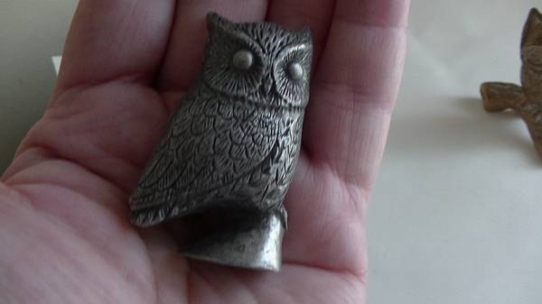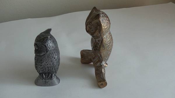 Two solid metal owls. One is a solid brass figurine. The other one is a steel figurine.