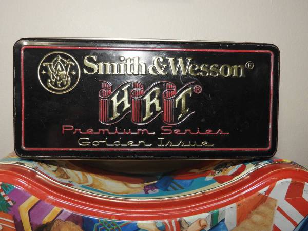 - - nice graphics - a few dings, lid loose - 1 Smith & Wesson tin - good condition - $3.00 for lot - will trade for other tins See my other ads