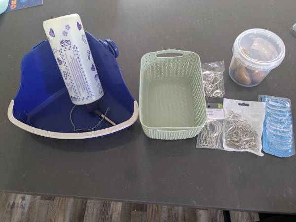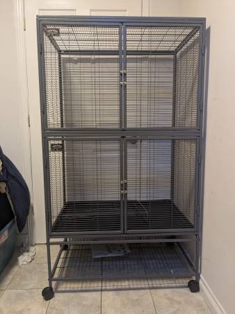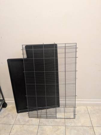 Critter Nation cage. Includes bedding, litter box, water bottle, hammocks, hooks, bin and cement mixing tray that I used for bedding in the bottom of the cage.