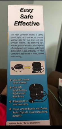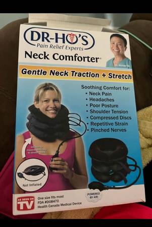 This Dr. Ho's Neck Comforter is brand new, still in its original packaging, offering gentle neck traction and stretch for soothing comfort and pain relief. It features an extra-soft velvet material, a high-efficiency hand pump, and adjustable sizing for most necks. Its double-layered bladder with double-sealed edges ensures long-lasting durability.