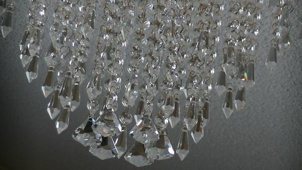 A brand new, in-box, real crystal chandelier with a long chain has never been used. It features a gold-colored metal base.